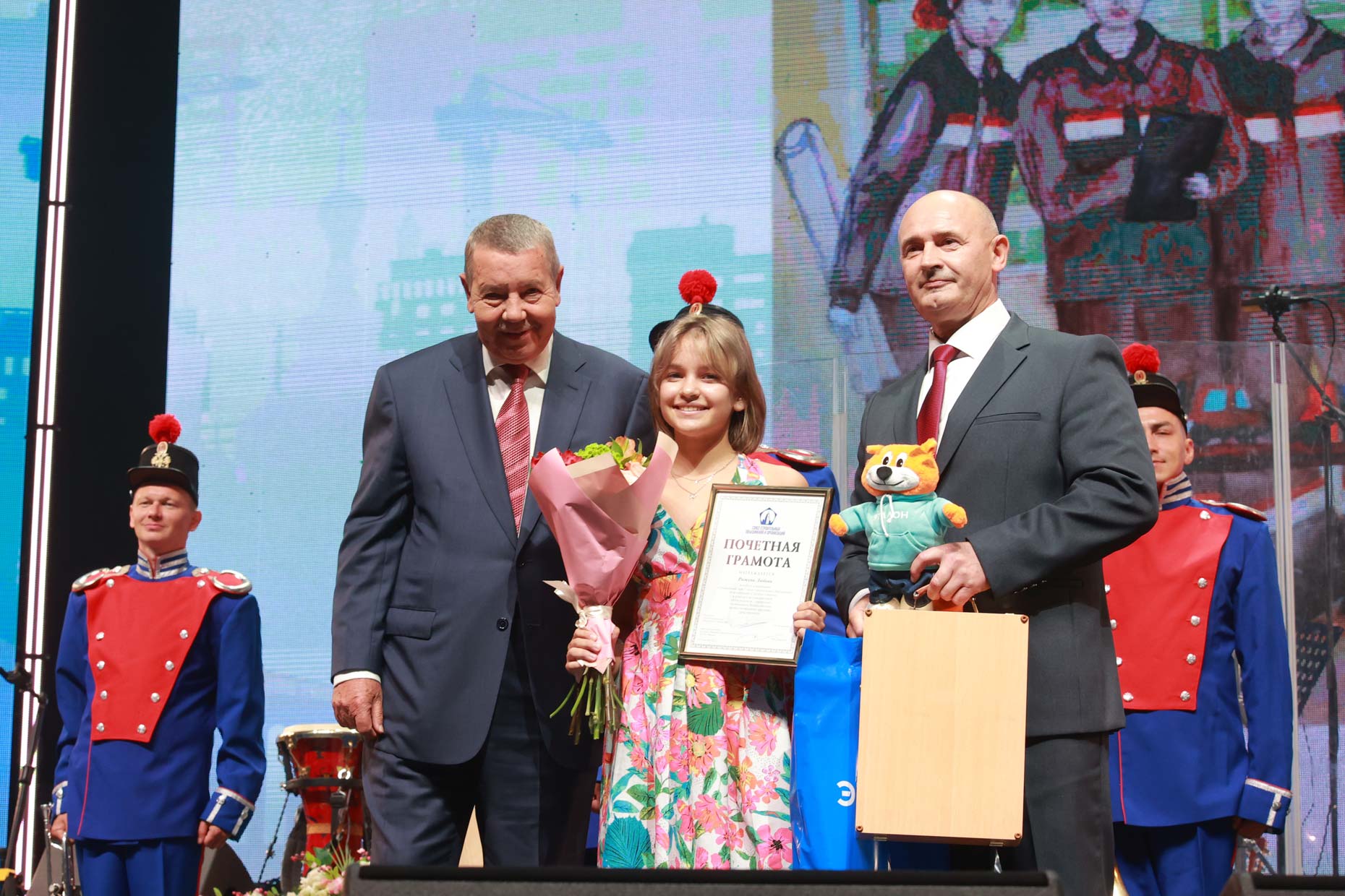 Победительница 12 конкурса рисунков Любовь Ражева вышла на праздничную сцену. Заместитель директора Управления по СЗФО Группы «Эталон» Сергей Шолохов вручил юной художнице этюдник и принадлежности для рисования — для новых побед.